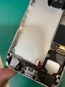 バッテリーシールを剥がす際、ひっかかることがあるので、バッテリーのすぐ下についているバイブレーターも外しています。なので、普段は隠れて見えない、バイブレーターのケーブル接触部分が見えてますね。赤い丸で囲んだところが接触するところです。