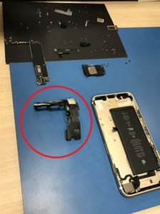 これが、基板を取り外した本体内部です。細長いバッテリーの下にあるのがバイブレーター(TAPTIC ENGINEとの表記)、その右にあるのがスピーカーです。この二つの部品も取り外してやっと、充電コネクタの部品が交換できます。