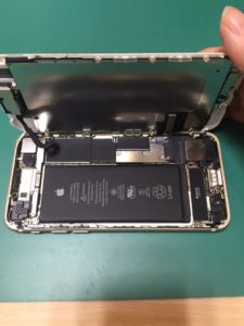 いつもは分解したところの写真を載せていますが、今回はちょっと趣向を変えて、開けてすぐのところを撮ってみました。ケーブルの関係で、iPhone7はこんな風に開きます。