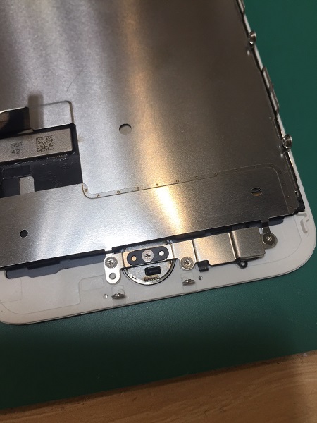 ということで、今回はホームボタンの裏面です。こんな感じで、裏側からネジとカバーで固定しています。iPhone7以降は物理的に押すボタンではなくなっているので、ゆるみがないようしっかりネジ止めしています。
