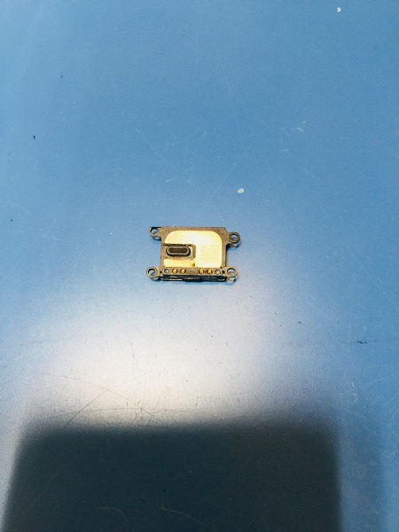 こちらが、壊れてしまったイヤースピーカーです。よーく見ると、ちょっとだけへこみができてしまってます。これまでも何度か落としてしまい、画面の交換をしていたとのことだったので、衝撃の影響がとうとう出てしまった、というところかもしれません。