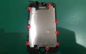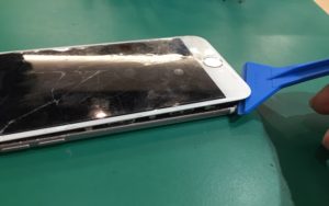 1.iPhone下側のネジを外して専用のヘラを使いフロントパネルを少しずつ起こしていきます。