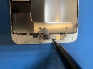 ホームボタンを抑えるメタルカバーのネジを外しているところです。