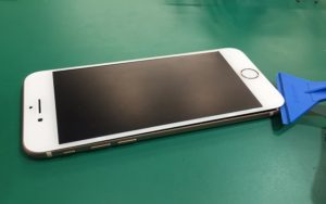 1.iPhone下側の2本のネジを外して、専用のヘラを使いフロントパネルを起こしていきます。