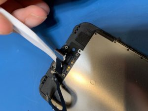 写真では、インカメラのガイド、イヤースピーカーを外し終え、近接センサーのついたケーブルを外し始めるところです。