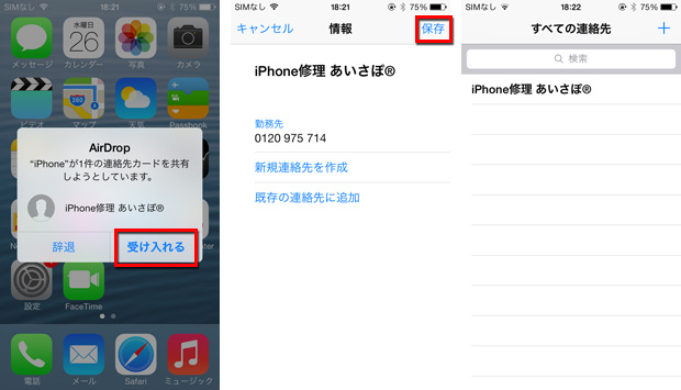相手側は[受け入れる]をタップした後、[保存]をタップ。これで、連絡先の登録は完了です。