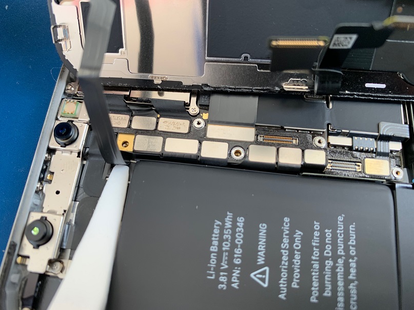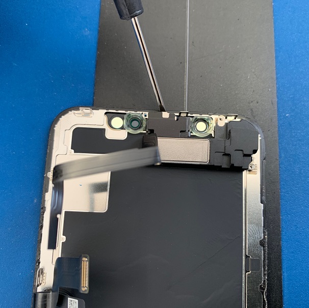 写真の箇所はFace ID(顔認証)と繋がっている部品で壊れやすく、また下のケーブルにテープでくっついているため、ヘラで慎重に剥がしていきます。