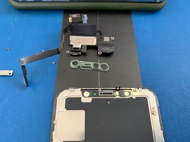 画像の部分は、イヤースピーカー・明るさセンサー・インマイク・近接センサーがまとまっていますので慎重に一つずつ外していきます。