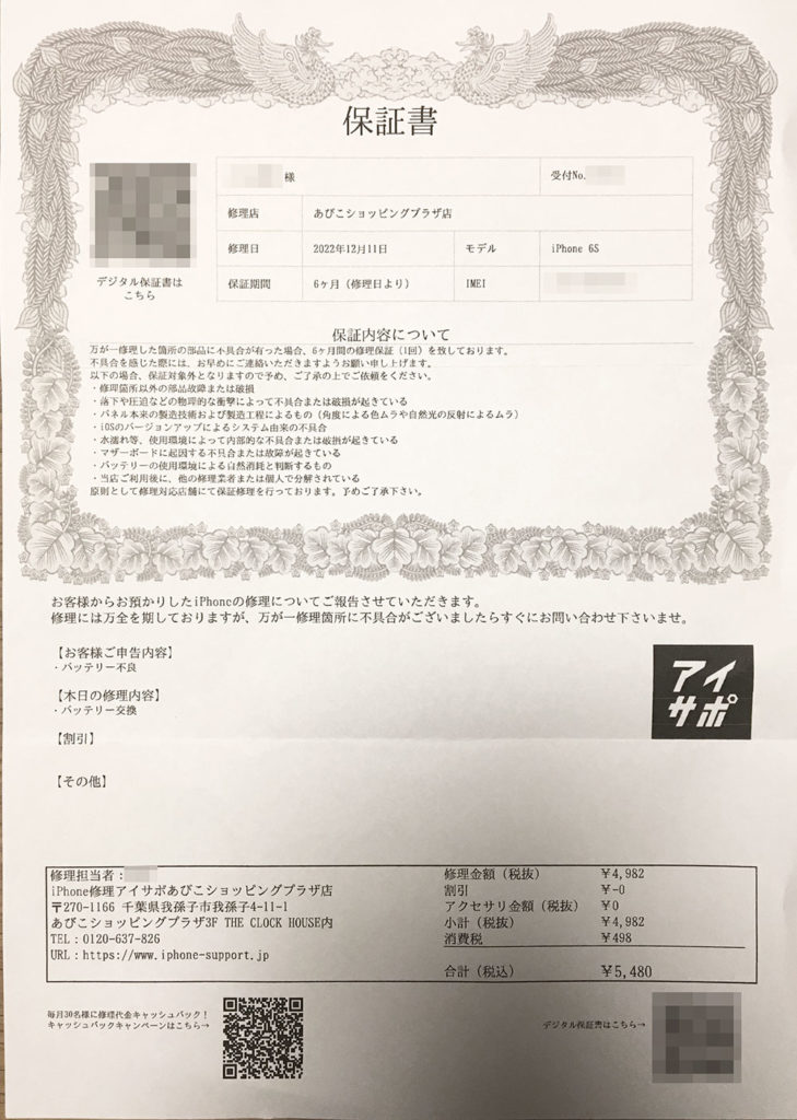 私の場合はバッテリー交換だったので、6ヶ月の再修理無料の保証があれば必要十分で、特にこのほか求めるものはありません。