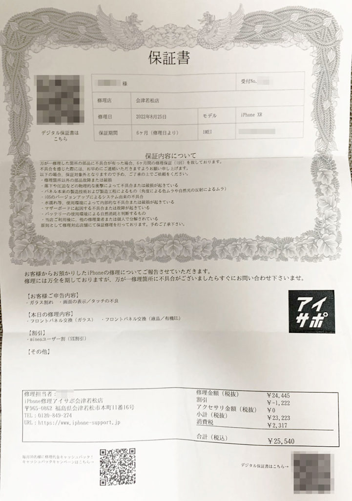 修理にかかる時間に関しても思ったよりはやかったです。