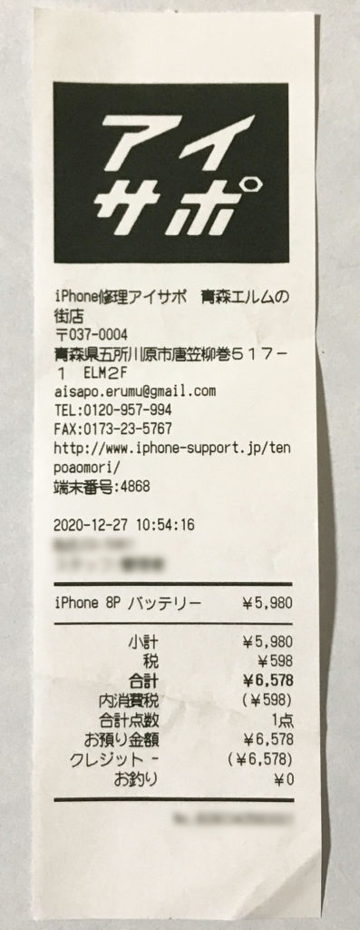 キャリアのサポート期間も対象外であり、アップルの正規修理店でもネットで調べた目安の価格だと10,000円超を覚悟しなければならない修理価格でした。しかし、あいさぽでは半分程度の価格でおさまり安かったです。