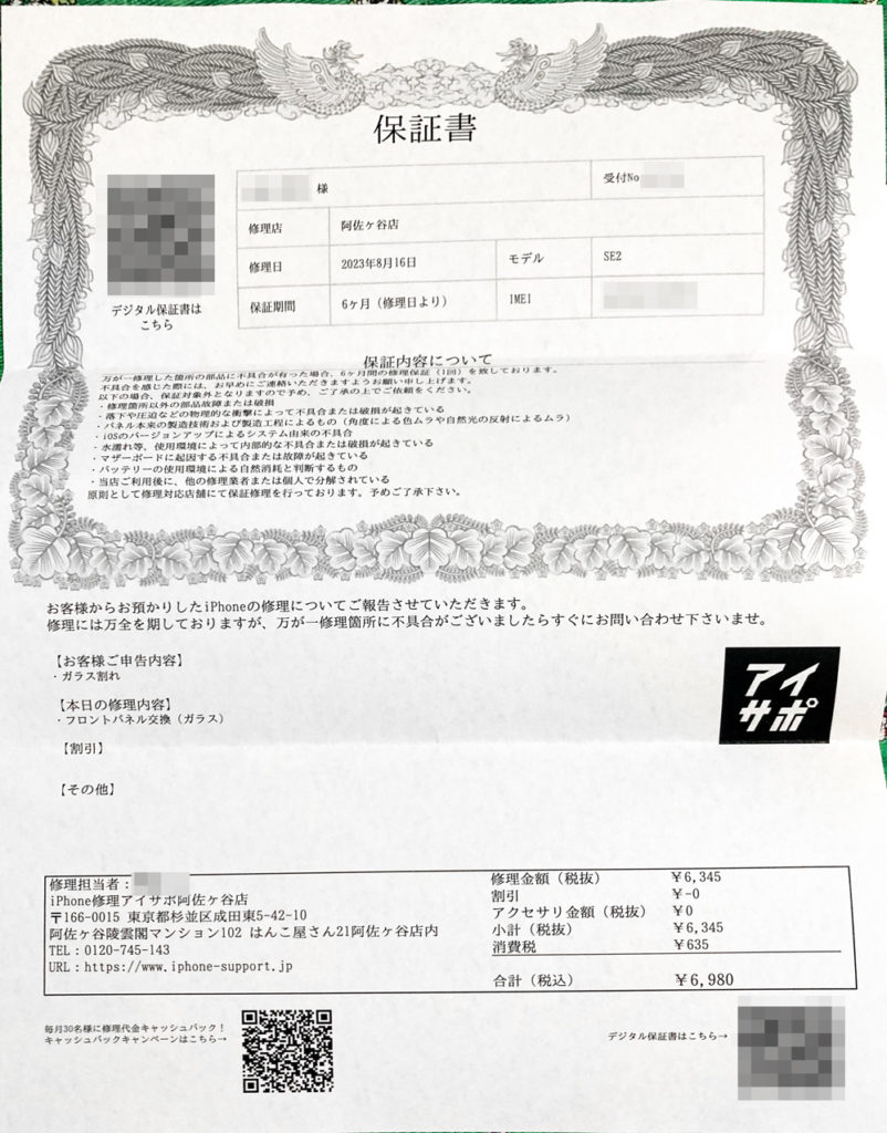修理後の不良についての保証があるのはありがたいです。ただ再度画面を割ってしまったり水没したりした場合は保証対象外とのことだったので、そういった場合でも有料でもいいので割引で修理してくれると嬉しいです。