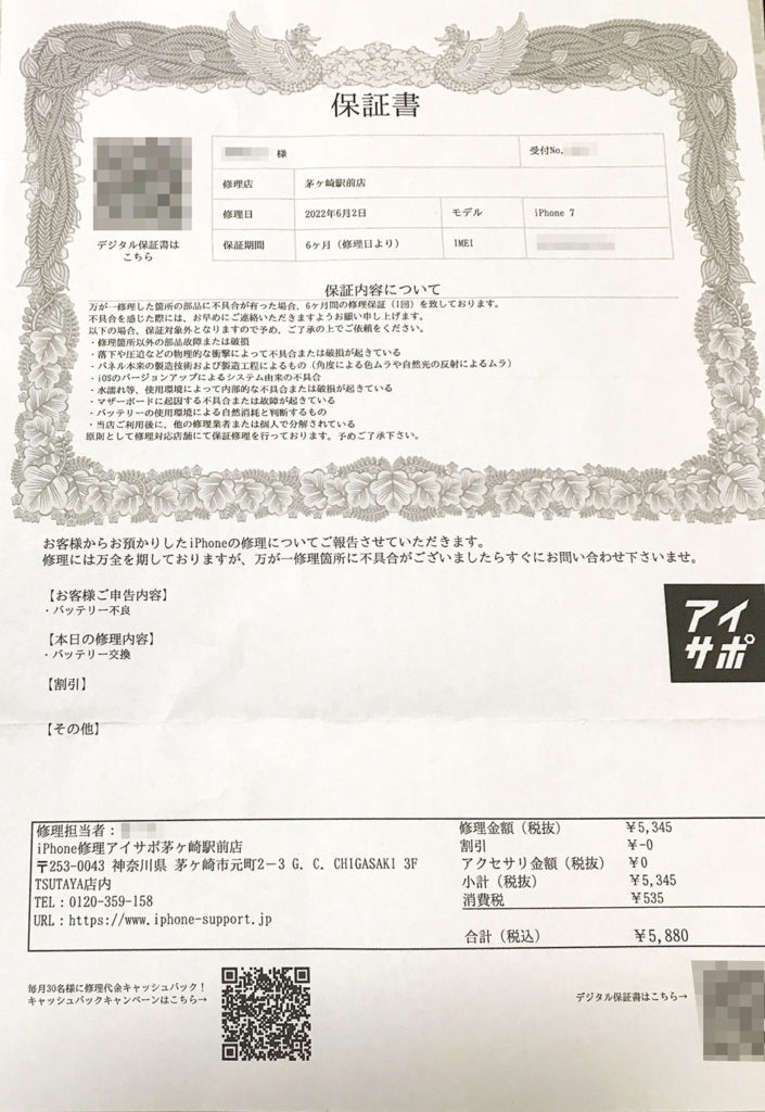ちょうど一日使用しましたが、気になっていた電池の減りもなく、仕事の空き時間にさっと直していただけた事、保証書発行、今回は、バッテリー交換なので自然消耗と判断できるものは、保証対象外になりますが、バッテリー交換による、不良の改善が見られない時は、ご持参ください、と、説明もいただけ、安心して、使っております。