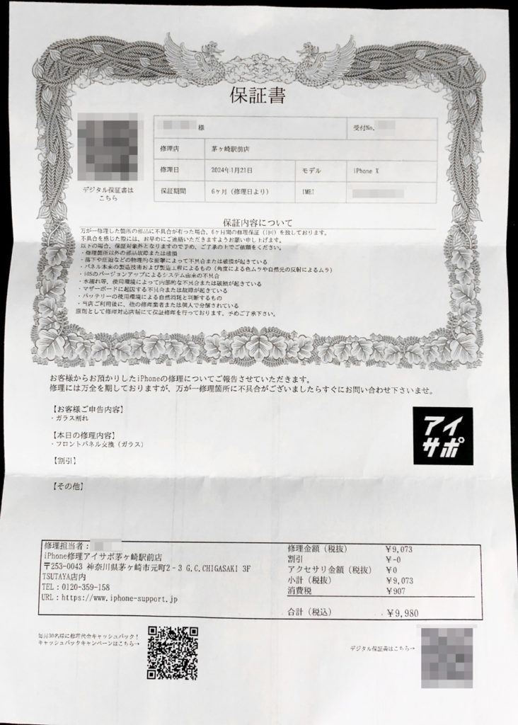 今回はフロントパネル交換で修理の為に、店舗へ来店致しましたが、おすすめは出来るかなと思います。ただし、メーカー公認の修理ではないので、当然修理で使われる交換部品も代替品である事、修理を受けた場合には、メーカーからの修理保証は受けられないという点には十分に理解した上で、応急処置という意味では、修理で利用するのはオススメ出来ると思います。アイサポさん以外の修理店舗についても個人的に調べた事がありましたが、比較的、修理料金は抑えられていると思います。