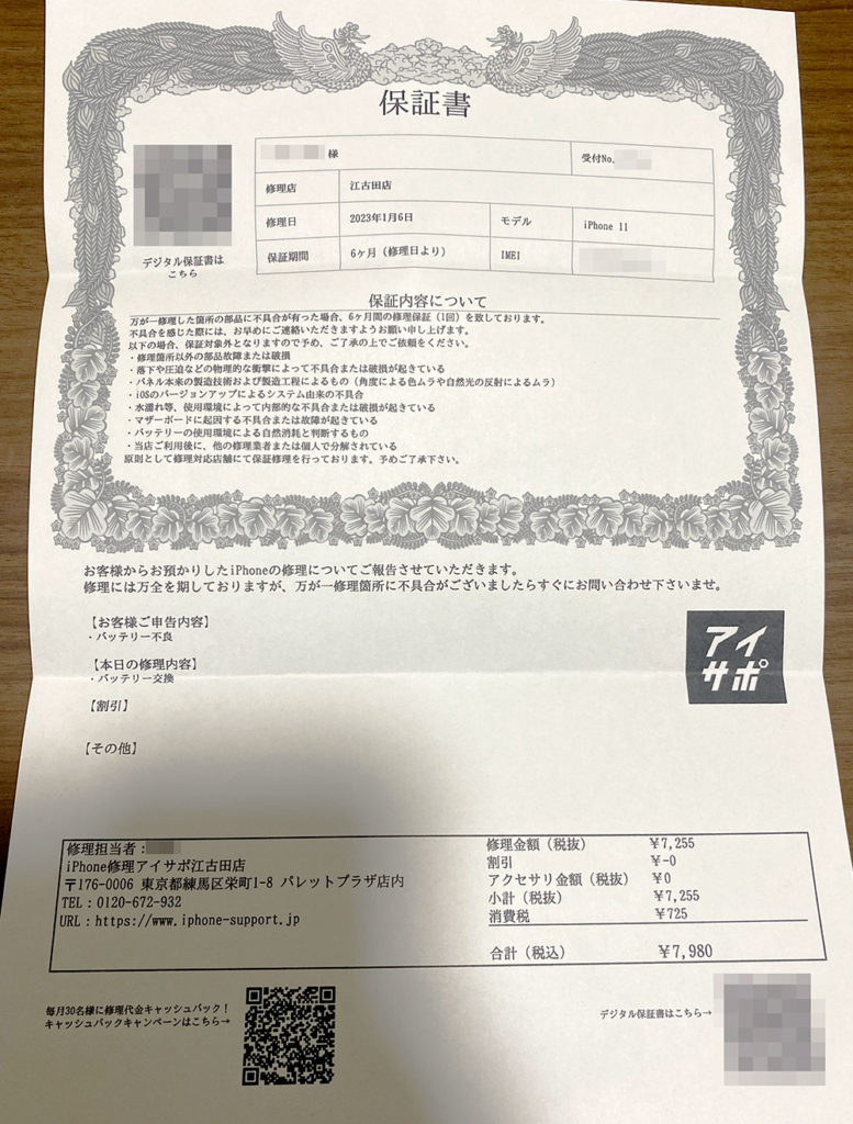 今回バッテリー交換をしていただきましたが、純正のものと変わらない持ち具合を復活させていただけたこと、またそれでいて公式よりもお値段はかなりお安くできたことが周りにおすすめできると感じました。また、2カ所以上の故障は同時に修理すると割安でできるのも魅力的だと思います。HPによるとmineoなどを使っていればさらに安くなるとのことで、実際に家族にmineoユーザーがいるのでぜひおすすめしたいと思います。
