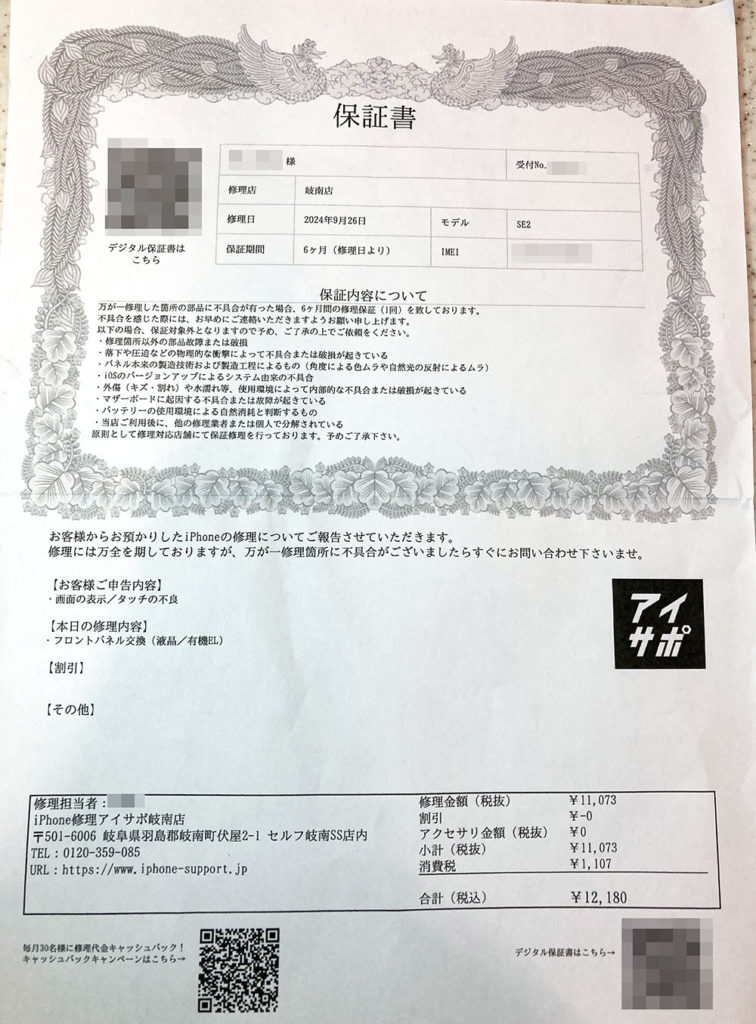 通常のアップルストアのような正規店と比較すると、全ての修理金額はやはり安いと思う。通常の金額でのイメージでは、今回の金額の倍くらいは費用がかかってしまう印象があるので、純正品にこだわらなければ安いと思う。