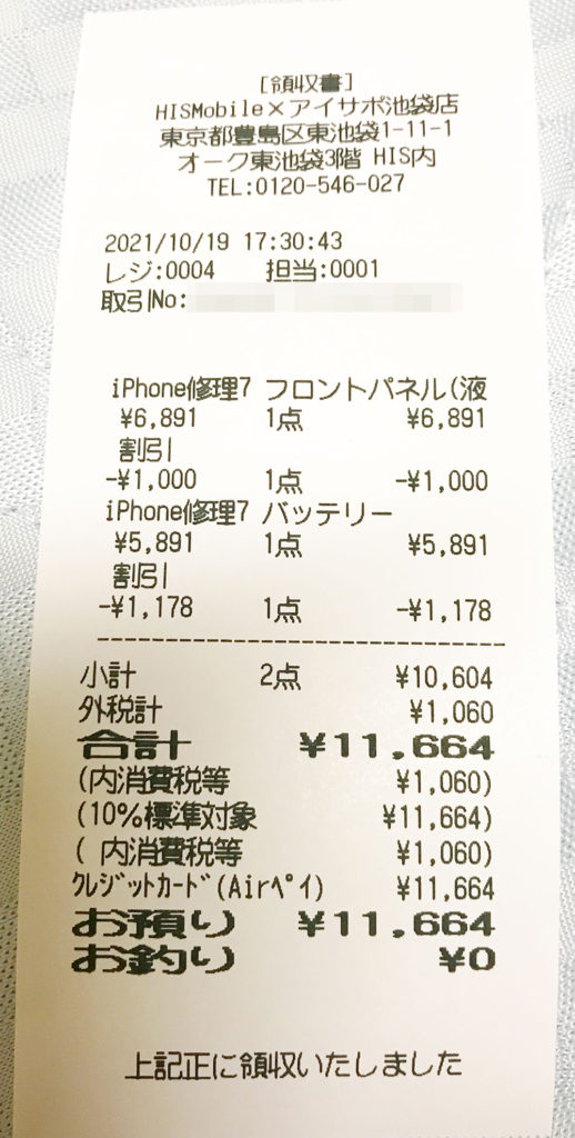 正規店だと画面修理とバッテリー交換で25,000円くらいかかってしまうところ、今回こちらでお願いしたら12,000円くらいでした。半額以下です。とても安いと思います。なんの保証にも入っていないので助かりました。