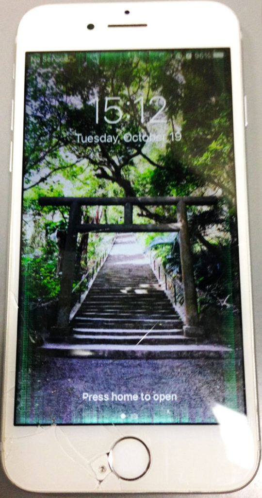 画面が割れてスリープボタンの辺りは欠け落ちて中が見える状態で、液晶には緑色の筋が入るようになってしまったのでその修理と、ついでに最大容量が72%まで落ちていたバッテリーを新しいものに交換してもらいました。