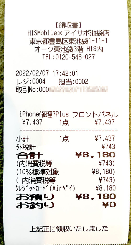 以前、アップルストアで他の家族のiPhone(液晶とパネルの両方)を修理していただいた時は2万円以上したと記憶していますので、アイサポ の修理料金はとても良心的な値段だと思いましたし、十分に安いと感じています。