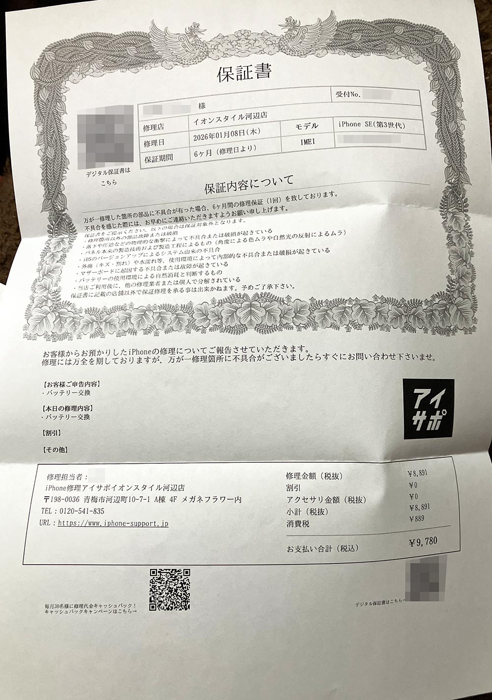 現在使用しているiPhoneを使用開始して3年ほど経ってきておりバッテリーが、75%まで減っていたので充電の減りが早く、動作にまで影響が出てきてしまったのでバッテリーを交換していただきました。