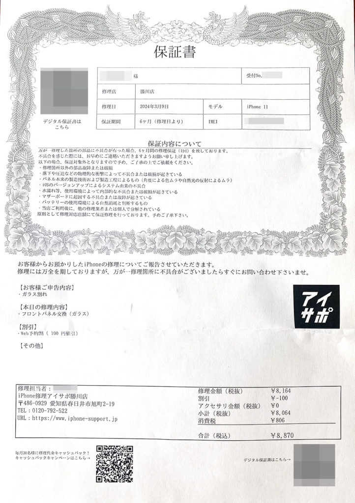 修理時間も結構かかるのかと思ったら1時間程で完了したのも良かったです。問題なく操作も出来ますし代金も安く時間も早いのがおすすめポイントです。。