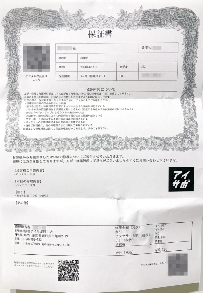 こちらのお店は予約がとりやすく、バッテリー交換だけでしたら、待ち時間が短いので、隙間時間に気楽に行けることと、修理代がリーズナブルなのに6ヶ月の保証もついているので、安心して修理に出すことができるので、私の知人や私と同時期にスマホを購入した家族も最近バッテリーが半日しか持たないと言っていたので、こちらのお店でバッテリー交換することをぜひすすめたいなと思っております。