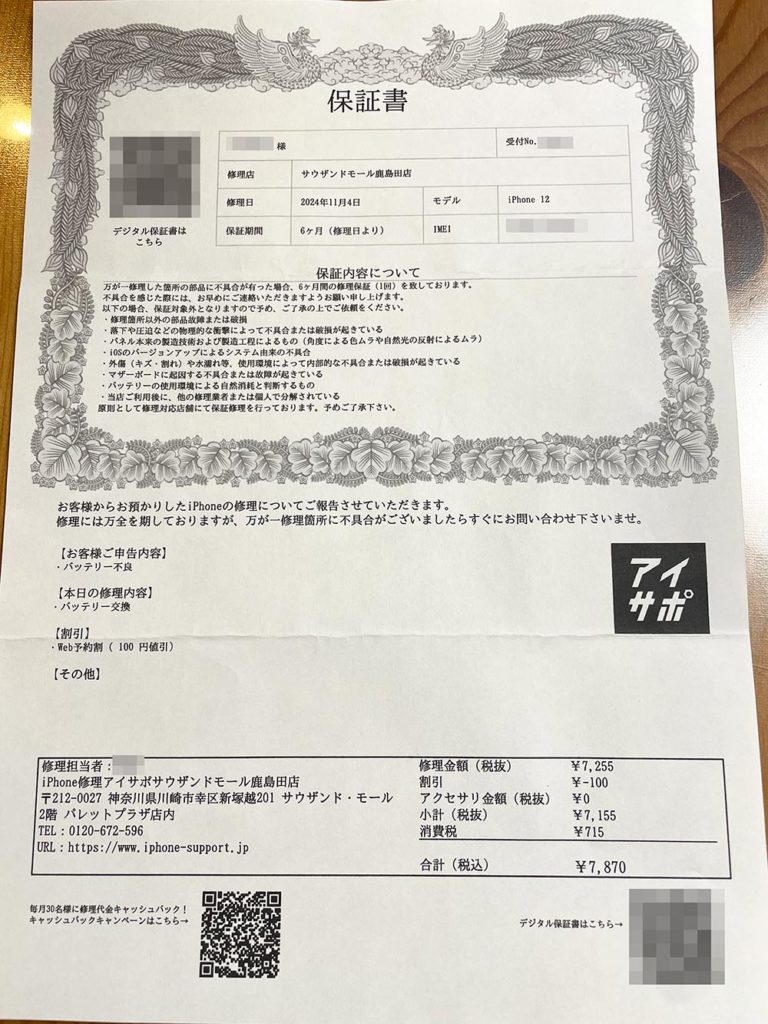 iPhone12を利用して3年以上経過しており、バッテリー最大容量が77%になっていたため、バッテリー交換をお願いいたしました。
