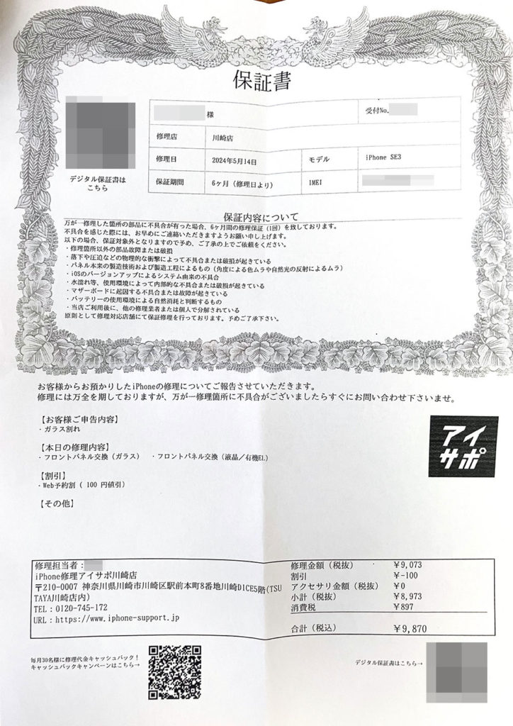 保証サービスは、今回の修理内容に不具合があった場合の保証のようなので、次回自分のミスが原因で再度液晶パネルが割れてしまった場合に受けられる割引などがあると嬉しい。次回も同じ金額だとやはり大変なので再度起こらないように気をつけようとは思う。