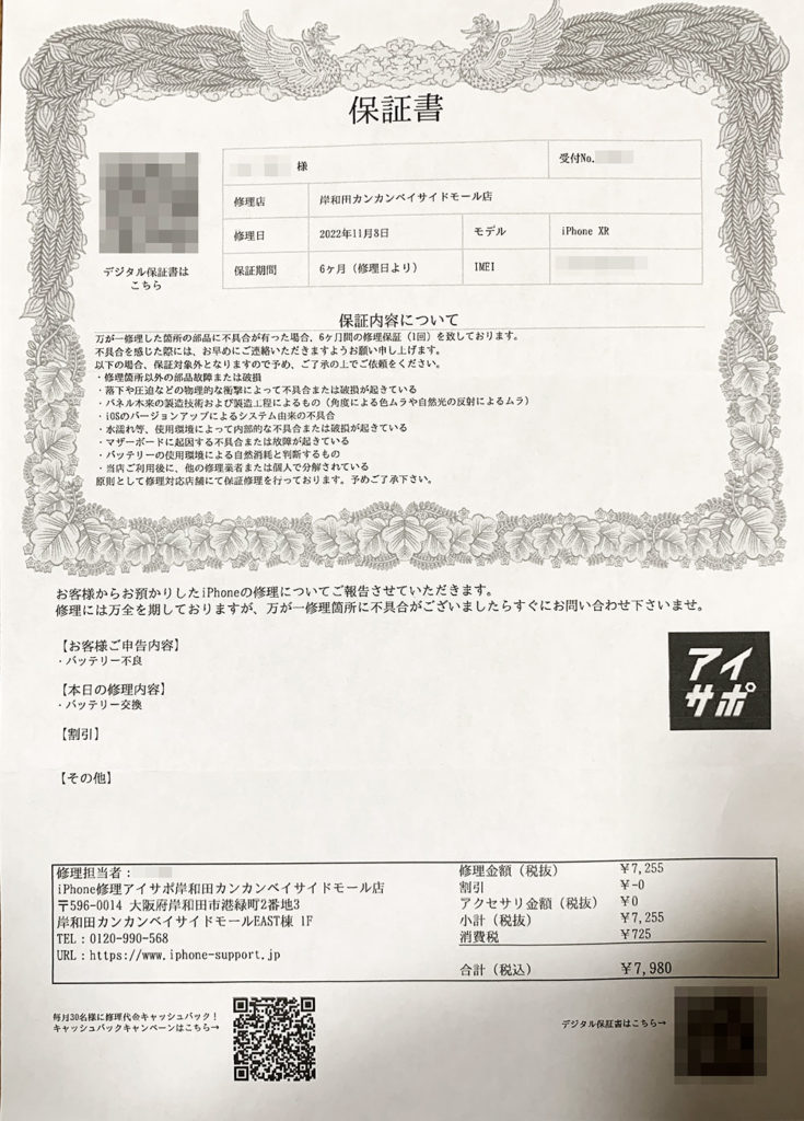 いろいろなお店のホームページで値段を確認させていただきましたが、正規のお店やキャリアショップで修理を出すよりもだいたい1,000円前後くらいは安いように感じました。同じサービスで安いのは単純に嬉しく思います。