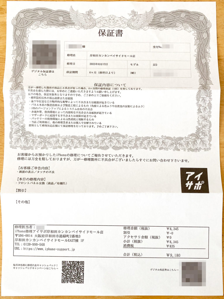 2年ほど大切に大切に使っているiPhone SE2が、何も落としたり水没したりしていないのに、画面の右半分が急に動かなくなった。店員さんが言うには、タッチパネル障害だとの事なので、フロントパネルを交換してもらった。