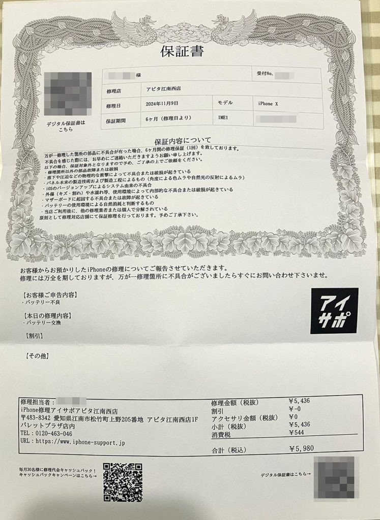 事前にWebで調べたところ、正規店やキャリアショップ、メーカーのバッテリー交換の相場は8,000円から15,000円程度ということだったので、今回のお店では6,000円程度ということでとても安いと感じました。