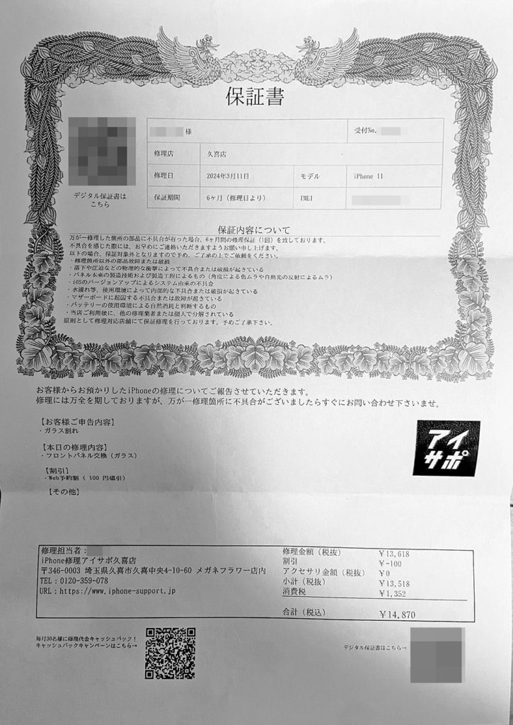 周りでも画面がバキバキのまま使っている人をちらほら見かけるので、「10万超える買い換えはすぐには厳しくても1万ちょっとで快適になるから修理いいよ」などと声をかけてあげたいです。修理の時間も1時間かからず早かったので依存症の人も許容範囲なのではと思います。純正品でなくても特に不具合を感じないので薬のジェネリック感覚でいいのかなと思いました。またメガネ店併設なので清潔感があり入りやすい店内である事もポイントが高いように感じました。