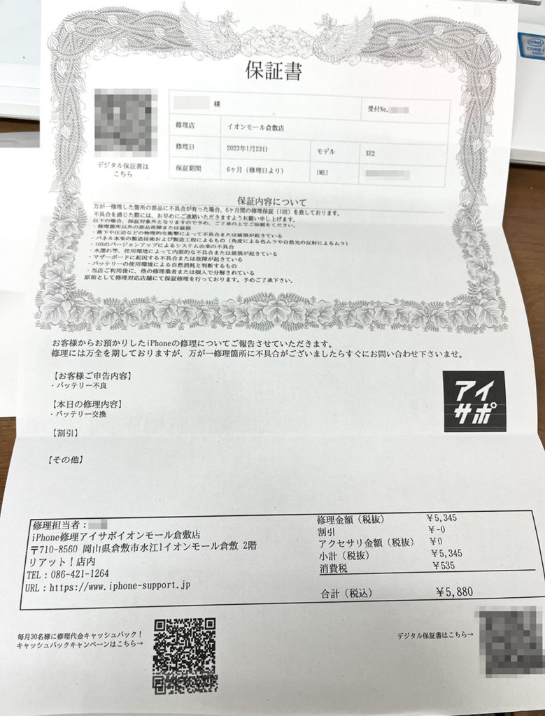 私が行った店舗は大型ショッピングモールの中に入っている店舗であったので、iPhoneのバッテリー交換をお願いしてからできあがりまでの1時間で有意義に買い物することができた。一応出来上がり時間も教えてくれていたが、お願いしておいたら電話もいただけて助かった。