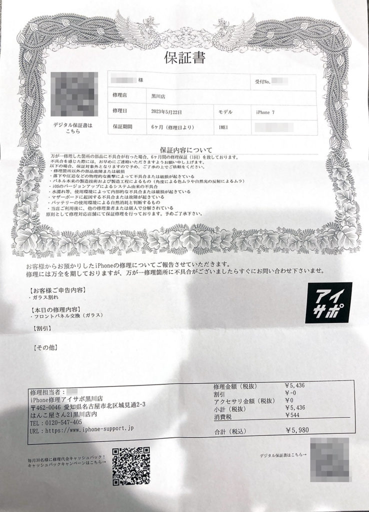 iPhone正規代理店だと1万弱はかかるはずなので、その6割ほどの金額で修理できたのは大変安いと思いました。Apple careに入っていても結局手出しはあるのと、預かり修理となり時間もかかるため、安価で短時間で修理できるのは良いと思います。