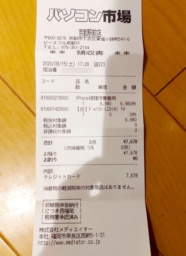 アップルケアには入っていないため、正規店、キャリアショップでの修理と比べるとかなり格安でしていただけると思いました。