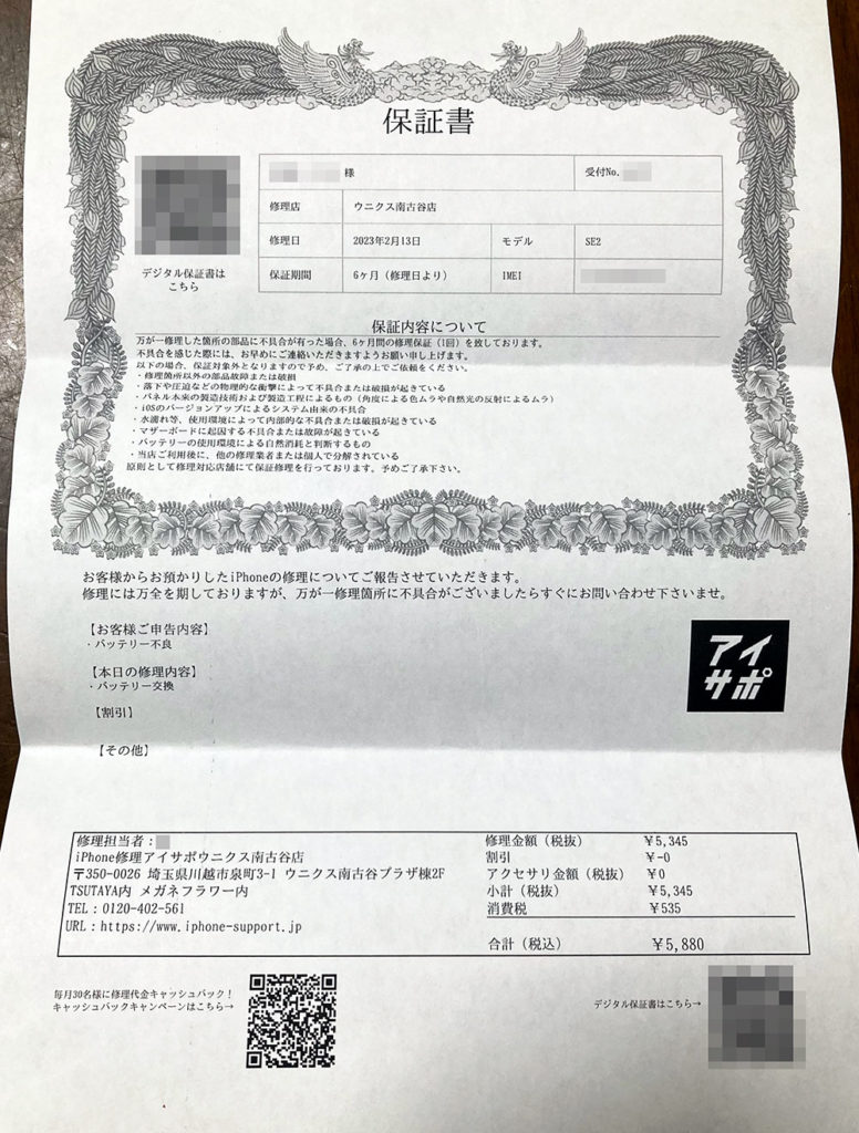 iPhoneの設定からバッテリー最大容量を確認したら80%となっていたため、何かあった時のことを考え今回バッテリー交換をしていただきました。