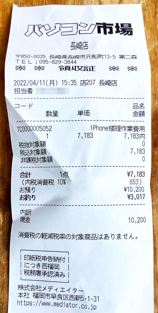 使用経過によるバッテリー劣化のため、iPhone本体のバッテリーの交換をお願いしました。