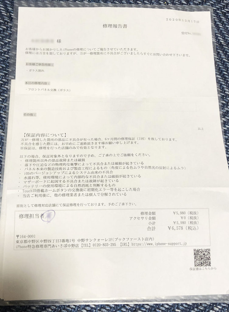 初めて非正規店で修理をお願いしました。そのため、パスコードを教えないといけないことを知らず、少し不安になりながら書きました。質問すればよかったのですが、、