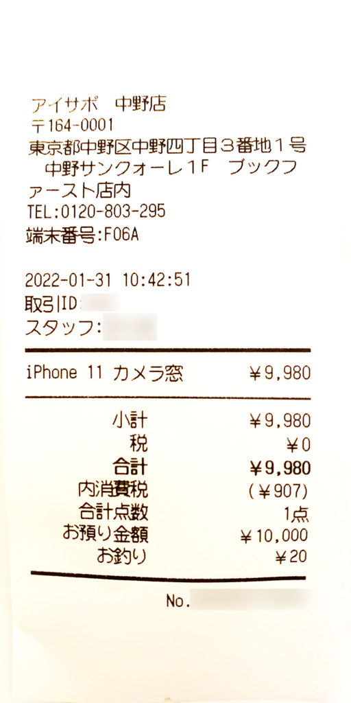 修理の時間は30分程度で、買い物の途中などでも気軽にやることができるので便利だと思います。修理後のカメラレンズは見た目的には修理したということがわからないくらい綺麗に修理されていました。修理後の使用も撮影に差し支えないレベルです。