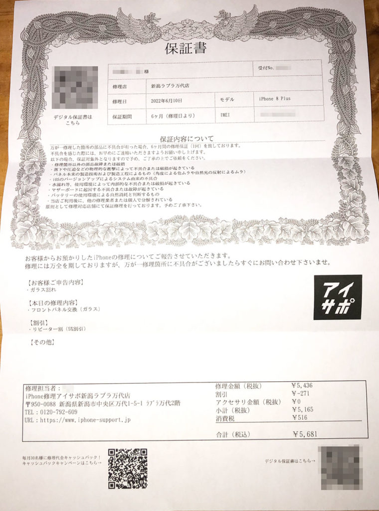 接客対応は料金説明やスペックの説明、保証の内容の説明や終わって帰る時の『この度は、アイサポ新潟をご利用頂きまして誠にありがとうございます』との声がけがありしっかり接客されていて非常に素晴らしいと思いました。BGM音量は複合施設なのでそちらの音楽が流れていて、その施設との一体感があります。店舗の雰囲気や清潔さですが、色々な画面シールが整然と並べられていて料金表やカウンター周りも清潔に整えられていましたので清潔感もあり雰囲気は良かったと思います。