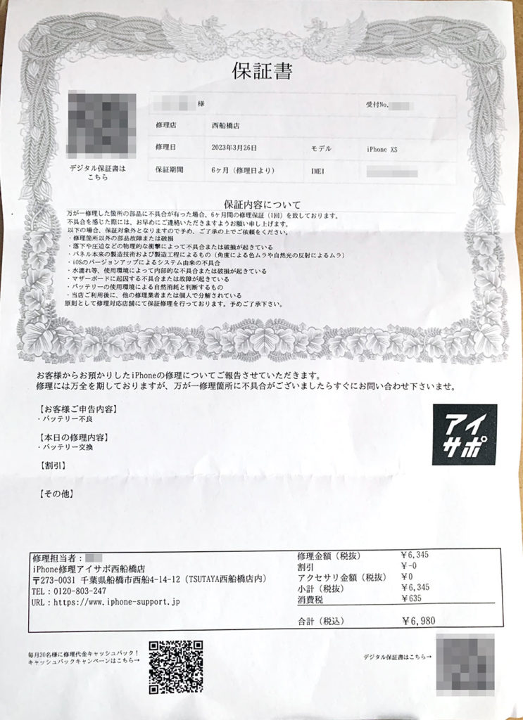 バッテリー交換後は紙にチェックをしながらiPhoneが正常に作動するか確認をしてくれ、また、言葉遣い等の接客対応はとても良かった。