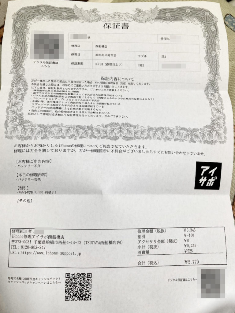 最初店内に入った時、TSUTAYA内に別店舗としてあると思ったのですが、それらしい場所が見当たらず、ウロウロしていたところ、店員さんが気にかけてくれて、声をかけてもらえたのでTSUTAYAで対応してることがわかりました。その後の接客も丁寧に対応してもらい、接客については問題なかったですが、TSUTAYA内だったので、修理時間中に座って待つ場所がないことが困り、待ち時間が大変でした。