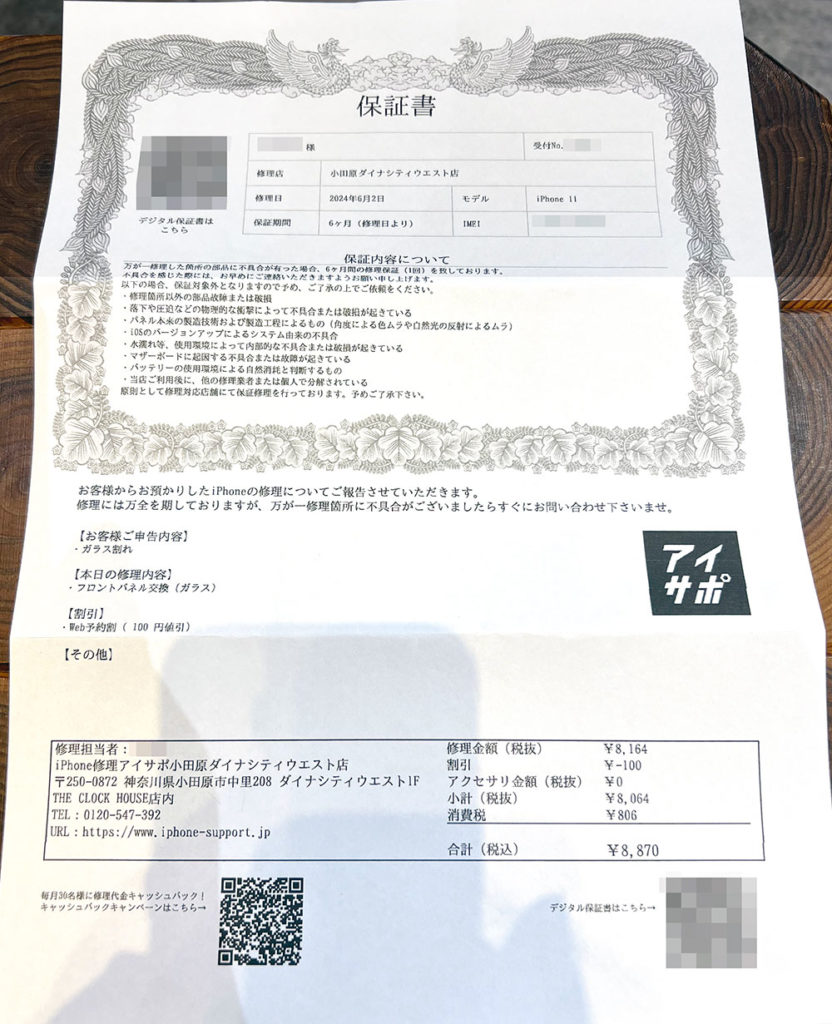 修理内容:安価グレードパーツへのガラス交換をお願いしました。