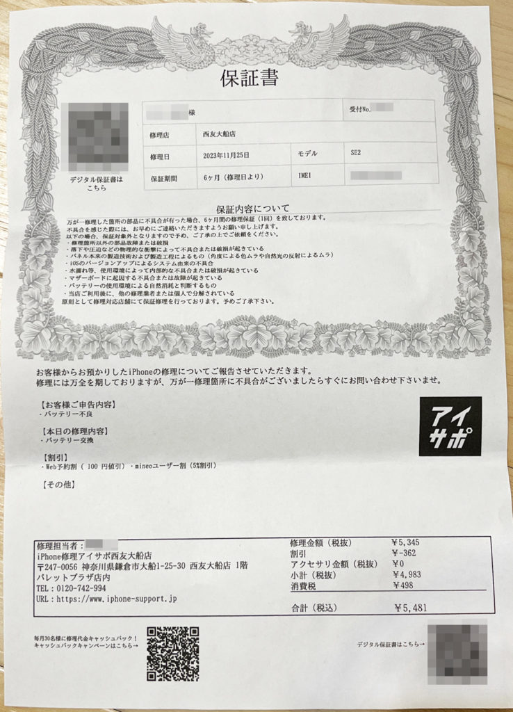 バッテリー交換作業らiPhoneの分解を伴う作業になるので不具合が起きた場合6ヶ月間無料で交換していただけるのはとても安心である。希望としては保証期間が6ヶ月間から1年間まで延長して頂ければより安心感がある。