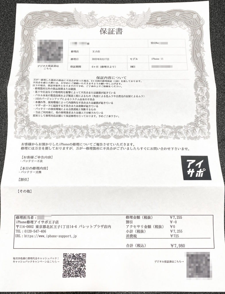 修理はとても安いと感じました。7,980円と言う値段はとても破格のように感じました。アップルストアやキャリアストアではその2倍いやそれ以上の価格がすると思います。それをこの価格でできることすごいと感じました。