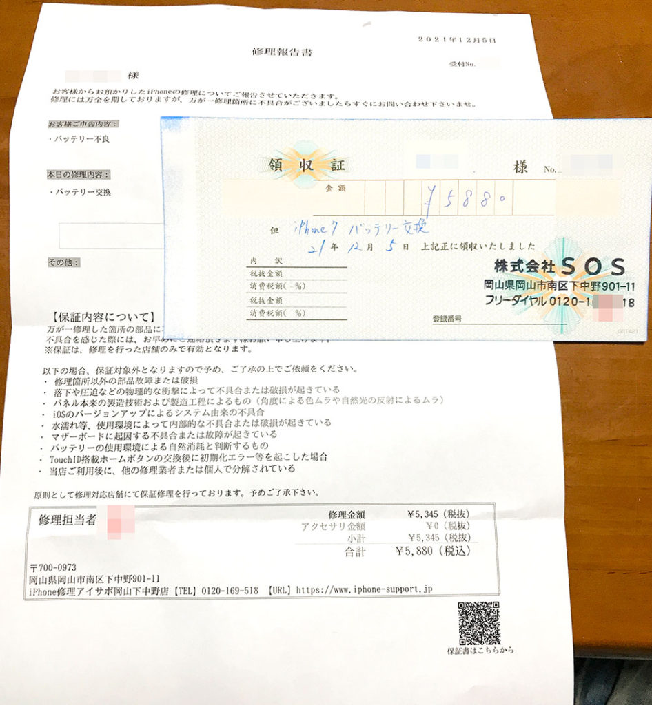 iPhone7を使って4年程度経過しており、今まで一度もバッテリー交換をしたことがなかったため、バッテリーの劣化が著しく、1日も充電をしていないともたない状況だったため、バッテリーの交換をするために修理依頼しました。