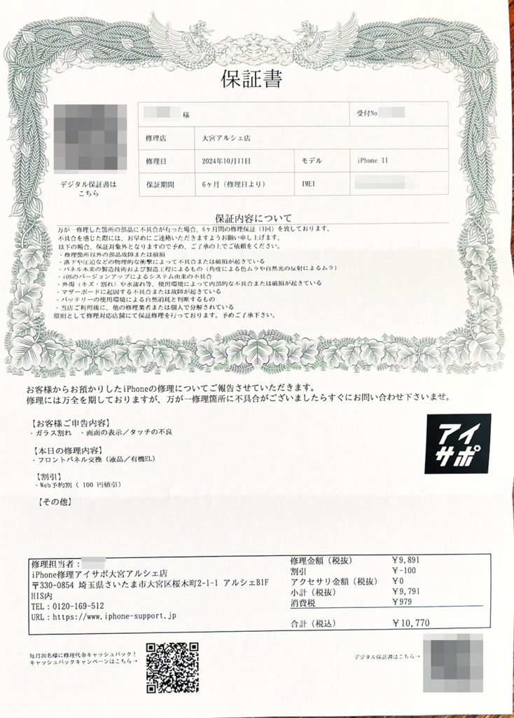 お預けする時画面が見えないのでどんな動作ができて、できないのかわかりませんでしたが、修理途中で不具合があった場合修理進めるかどうかの説明も修理後の動作確認もアフターケアの案内もしてくださって安心できます。使ってるうちに不具合が出ても保証があるので安心ですし、相談してくださいと言っていただいて良かったです。また何かあったらお願いしたいと思いました。
