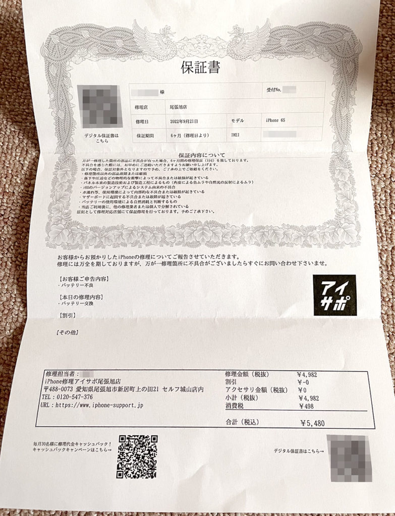 今回の修理箇所に限り不具合が出たら6ヶ月間は無償で修理してくださるとの事で、様子を見るのに十分な時間があるので、とても安心できました。