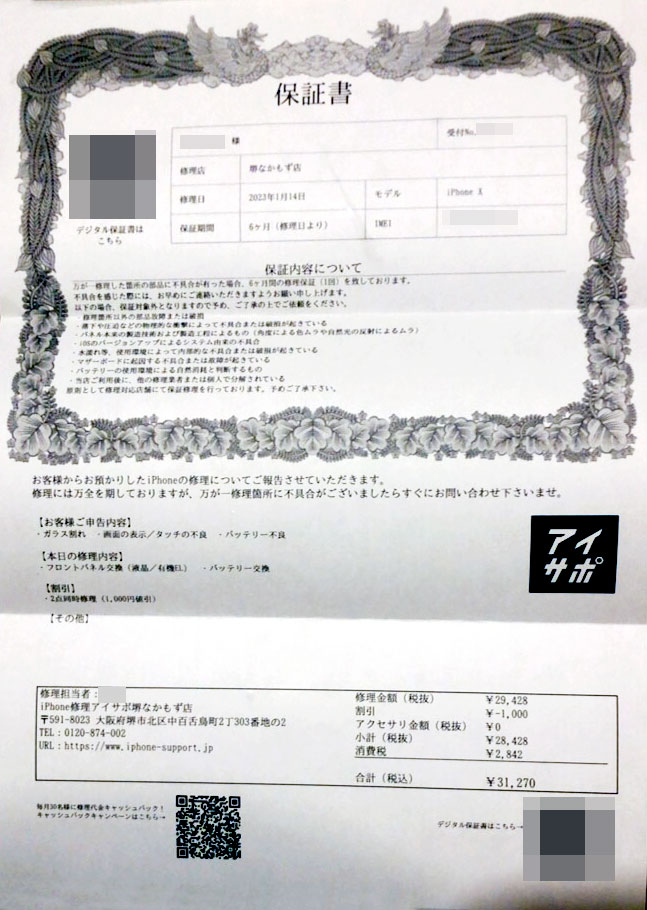 修理後の注意事項やキャンペーンについては案内があったのは嬉しかったです。