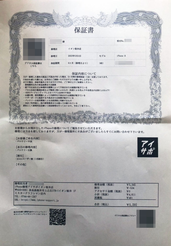 今回の修理で保証サービスが6ヶ月付いているのもかなりお得だと感じました。